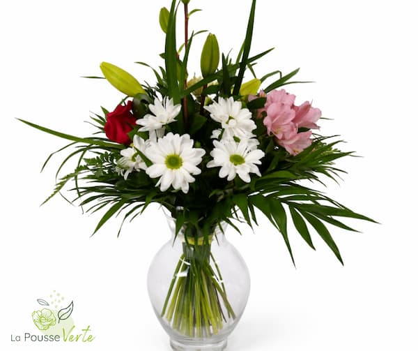Notre beau bouquet  blanc et rose avec une rose rouge. Les fleurs peuvent varier.